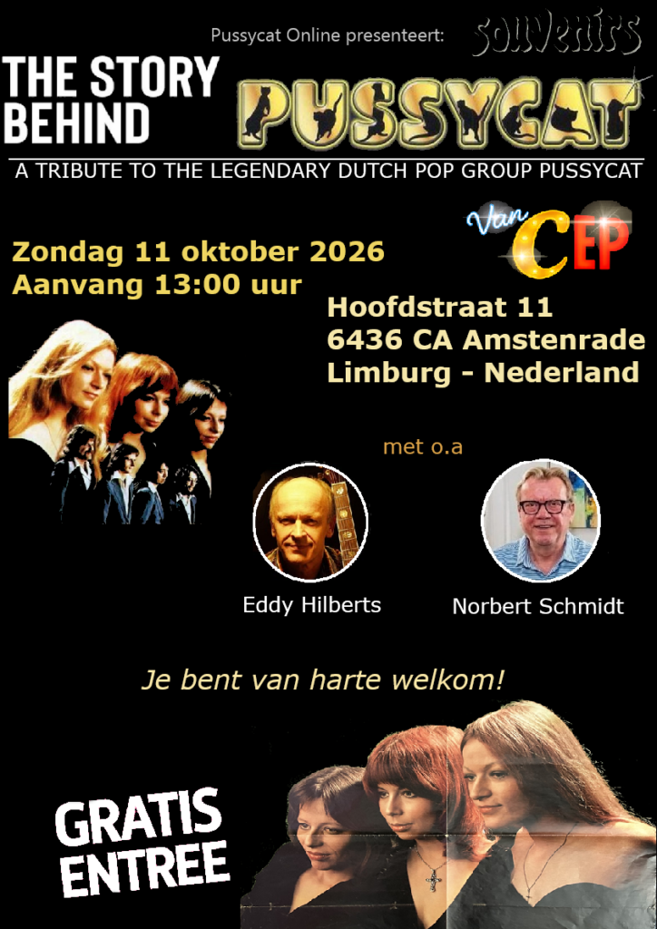 Você pode perguntar a elas tudo o que ainda não sabe sobre o Pussycat, e elas também compartilharão anedotas divertidas. Com a participação, entre outros, de Eddy Hilberts – produtor dos álbuns First Of All, Souvenirs, Wet Day In September, Simply To Be With You e do single Roll On Sweet Mississippi y Norbert Schmidt, compositor de Stranger In Town y demos inéditas de 1983. (O próprio Pussycat não estará presente neste dia)